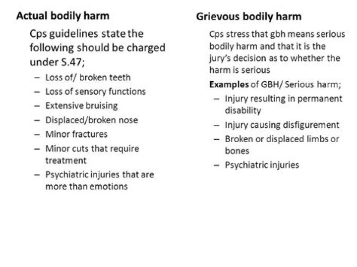 ABH can include injuries such as cuts, bruises, and broken bones, while GBH can include injuries such as loss of limbs, serious facial injuries, and organ damage. Both ABH and GBH can be charged as either a summary offense or an indictable offense, depending on the severity of the injuries.